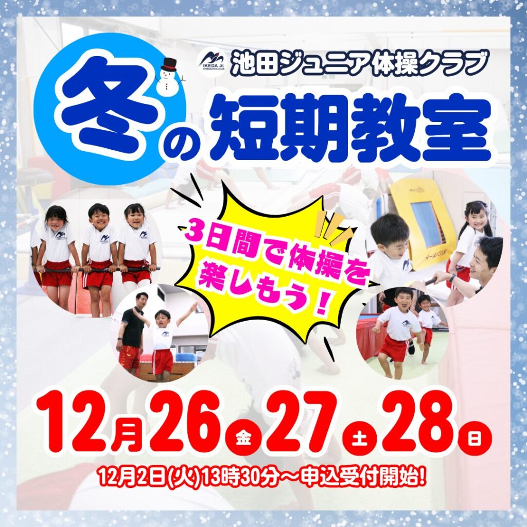 池田ジュニア体操クラブ2025冬の短期教室を開催します! 午前の部は宝塚教室、午後の部は池田教室にて12月26日(金)〜28日(日)の3日間連続で開催となります。 冬休みのタイミングに苦手を克服したり…