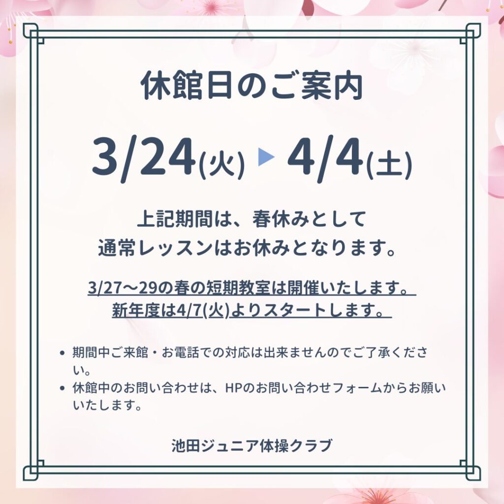 - 3月24日(火)~4月4日(土)は休館日です上記期間は春休みとして、通常レッスンはお休みとなります。新年度は4月7日(火)よりスタートいたします。 3月27日(金)… 続きを読む: 3月24日(火)~4月4日(土)は休館日です