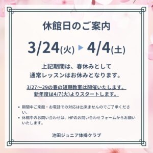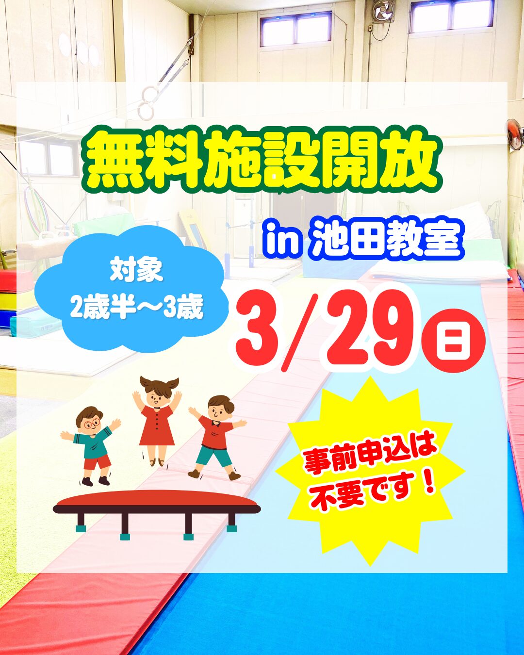 池田ジュニア体操クラブでは、3月29日(日)に、2歳半〜3歳のお子さまを対象とした施設開放を開催します。