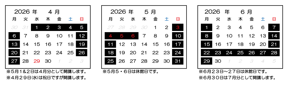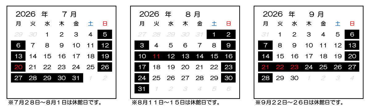 基本的に、月曜日・日曜日・祝日は休館日です。